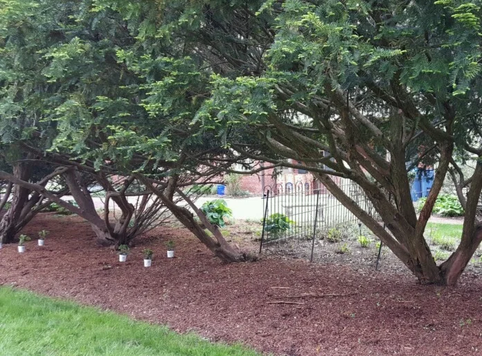 The existing taxus has been limbed up to reveal its beautiful architectural structure. It was then under planted with shrubs to create enclosure in the garden and perennials for color texture and form. The shrubs chosen were the newer cultivars of long use garden shrubs. Clethra 'Sugartina Crystalina', Viburnum 'All That Glows', Hydrangea macrophylla 'Bloomstruck', Rhododendron 'Bloom A Thon' series and more. These newer shrub cultivars represent the current trend in plant breeding to increase bloom size, lengthen bloom period, and to create compact plants more suitable to the modern garden. The herbaceous plants (perennials) are shade tolerant plants selected for foliage color or pattern and textural interest.